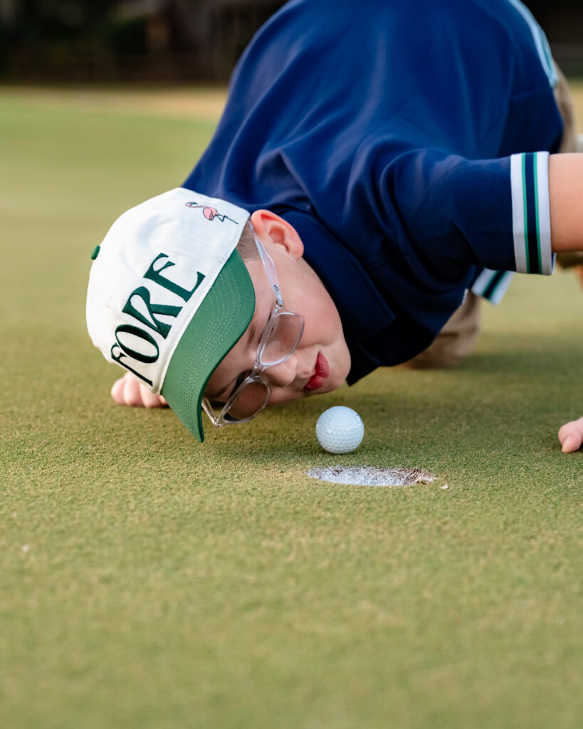 They brought custom green cups with their name printed on them and made the putting green feel like their own backyard hangout. The kids wore hats that said “FORE,” and the mix of polished outfits with casual sneakers kept everything grounded and real.