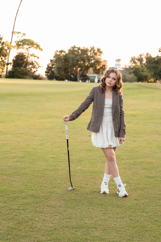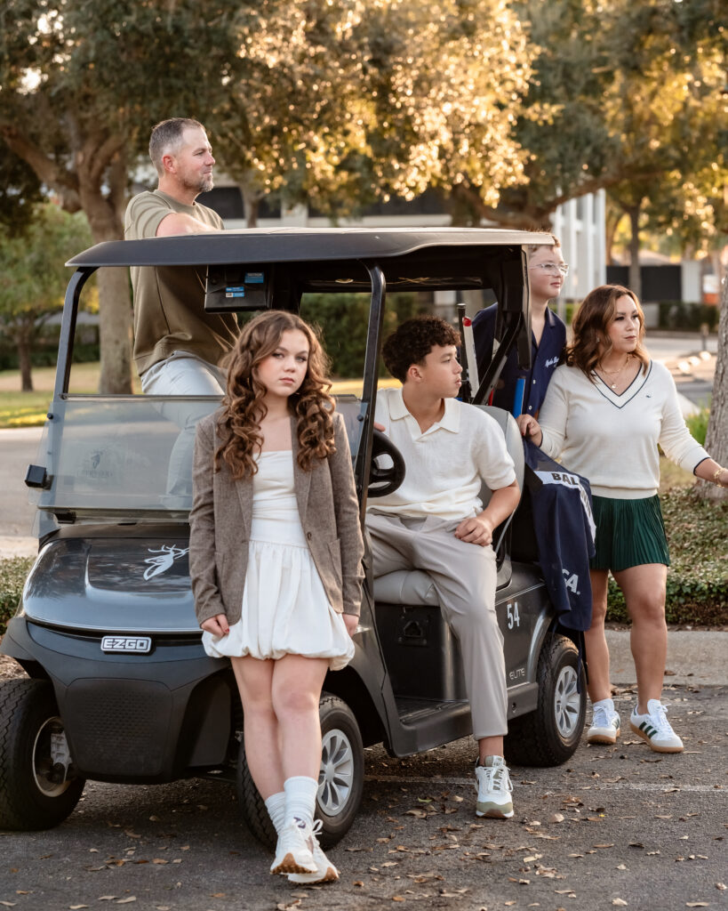 Instead of repeating their usual clean studio portraits, they decided to lean into something that is a huge part of their everyday life: golf. Deerwood Country Club in Jacksonville was not just a backdrop. It was familiar ground. It was where weekends are spent, lessons happen, and friendly competition naturally unfolds.