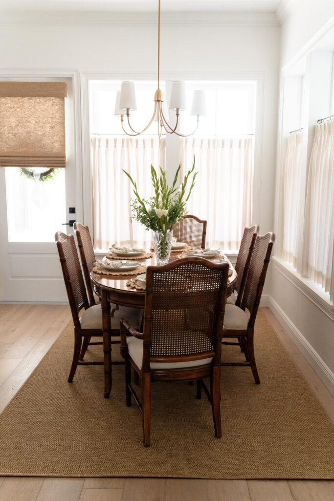 The dining room was flooded with natural light, its woven cane-back chairs and delicate floral centerpiece adding texture and charm. On the wall, a pair of bird illustrations in sleek black frames balanced the airy brightness with a sense of timeless sophistication.
