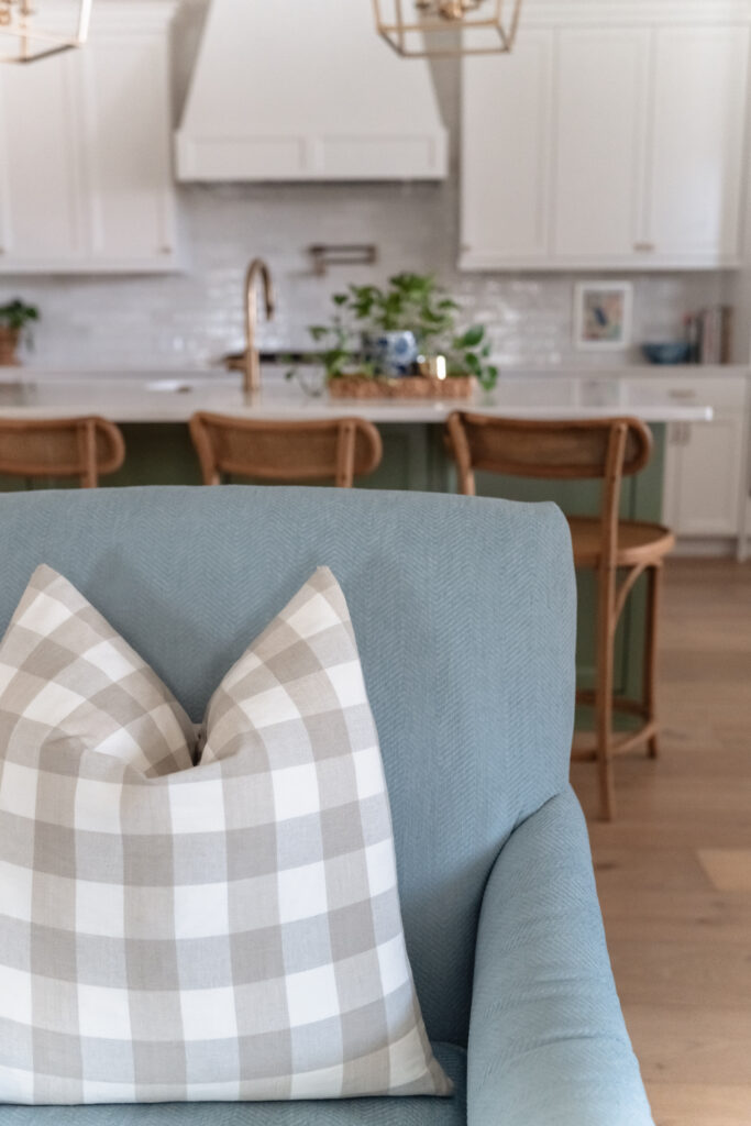 The kitchen, with mint-green cabinetry and brass lighting, connected beauty and function seamlessly. Shooting from the sitting area gave a sense of flow, the way every detail complemented the next.