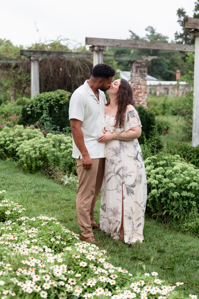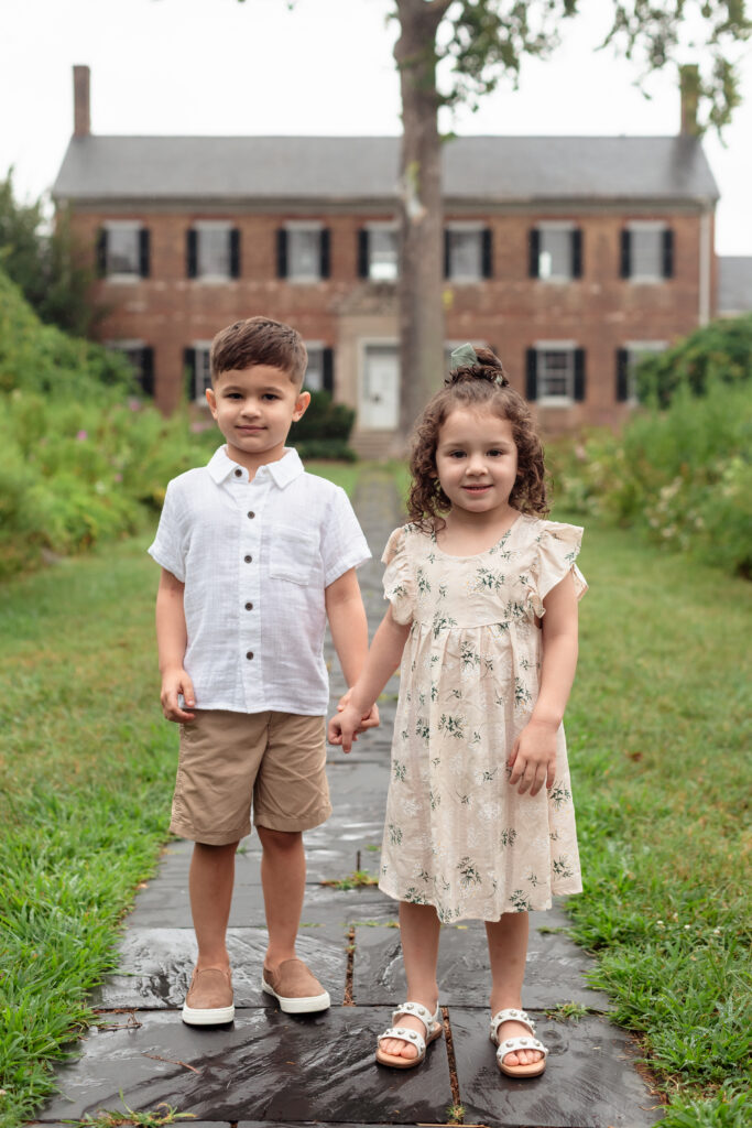 Chatham Manor in Fredericksburg was the perfect backdrop for this chapter of their story. The winding garden paths, brick architecture, and late-summer blooms created a dreamy setting where the kids could run, explore, and be authentically themselves. Mom’s neutral floral dress tied beautifully into the soft colors of the garden, and the baby’s headband stole the show in almost every frame.