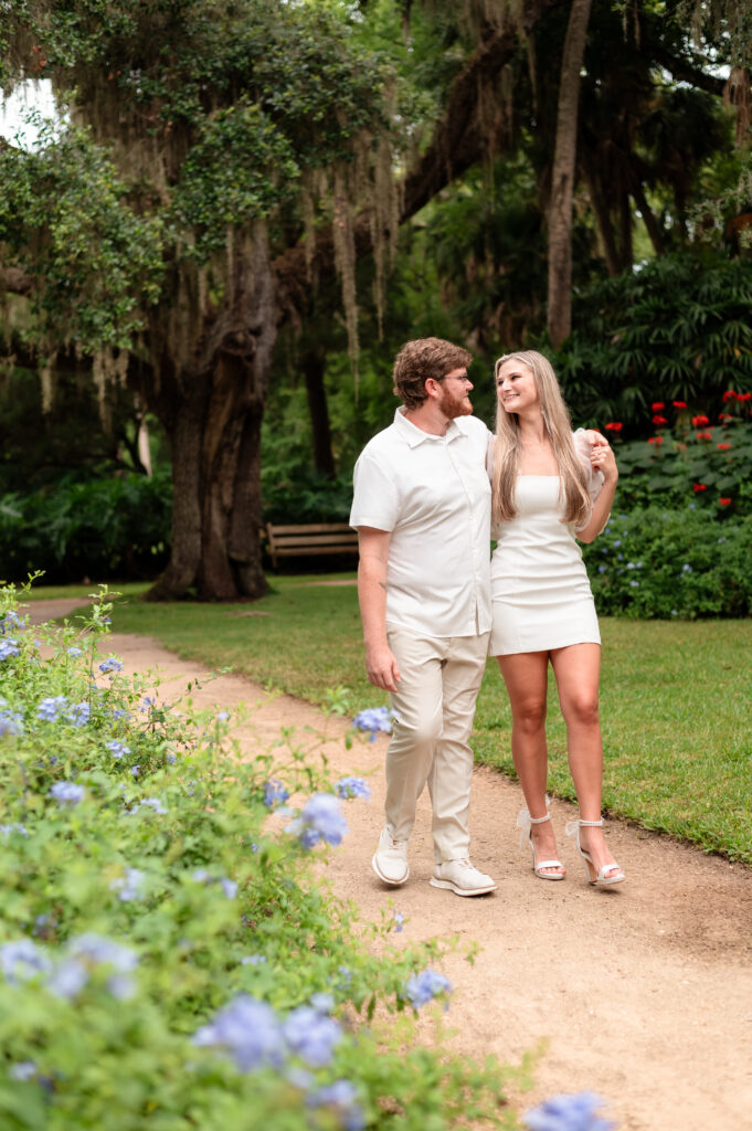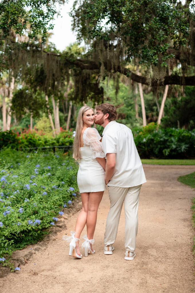 Soft greens, blooming flowers, and Spanish moss created the most romantic backdrop for their first photos as an engaged couple.