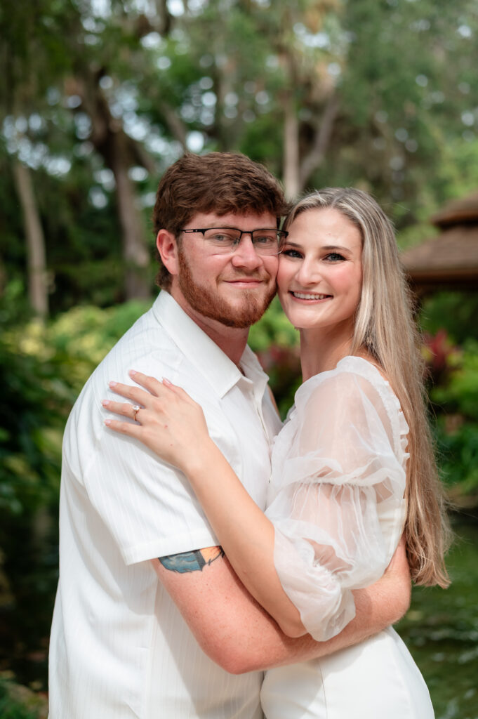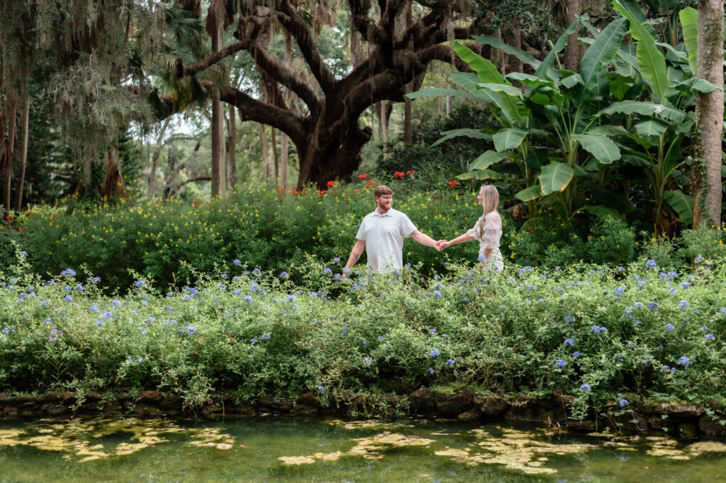 Washington Oaks is known for its lush greenery and timeless Old-Florida charm. Brandon chose it intentionally — a place that felt peaceful, romantic, and “them.” The two wandered past the koi pond, stopping here and there to admire the flowers and the way the light danced between the branches.